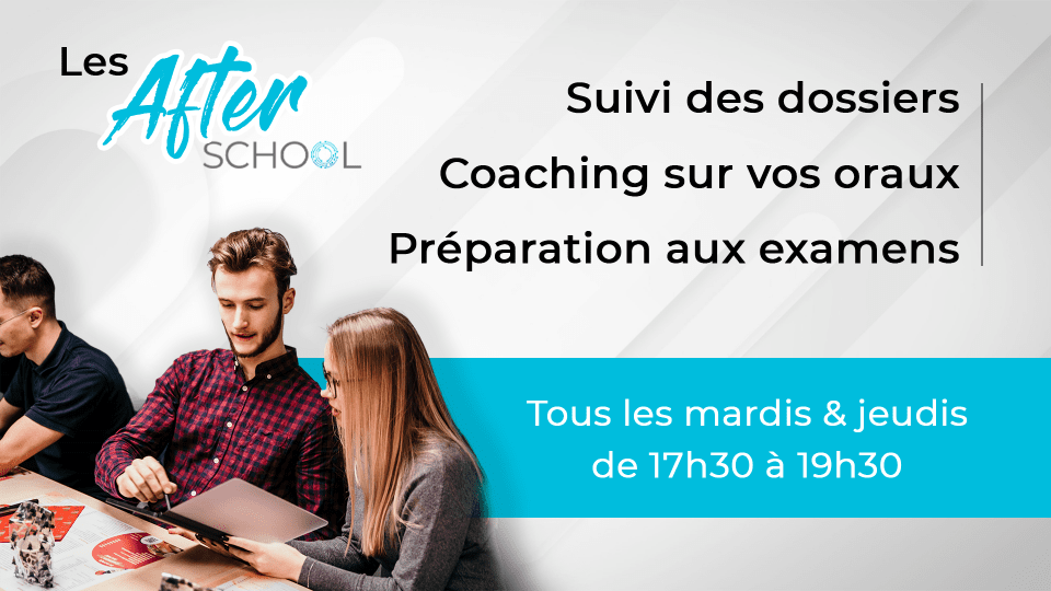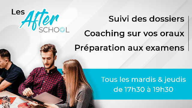 L'Afterschool est mis en place afin d'accompagner nos étudiants vers la réussite, avec des séances de coaching pour les oraux, des relectures approfondies des fiches/dossiers, et des conseils pour travailler la posture professionnelle.